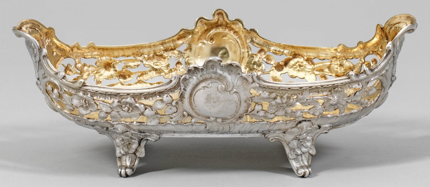 Gebäckkorb Silber, innen vergoldet. Ovale Form auf vier floralen Füßen, die Wandung mit naturalistischen Blütenzweigen durchbrochen ausgearbeitet. Mitte durch Rocaillekartusche akzentuiert, die Handhaben als Rocaillen ausgezogen. Gest. 800, Herstellerzeichen. Gew. ca. 380 g. B. 26 cm.
