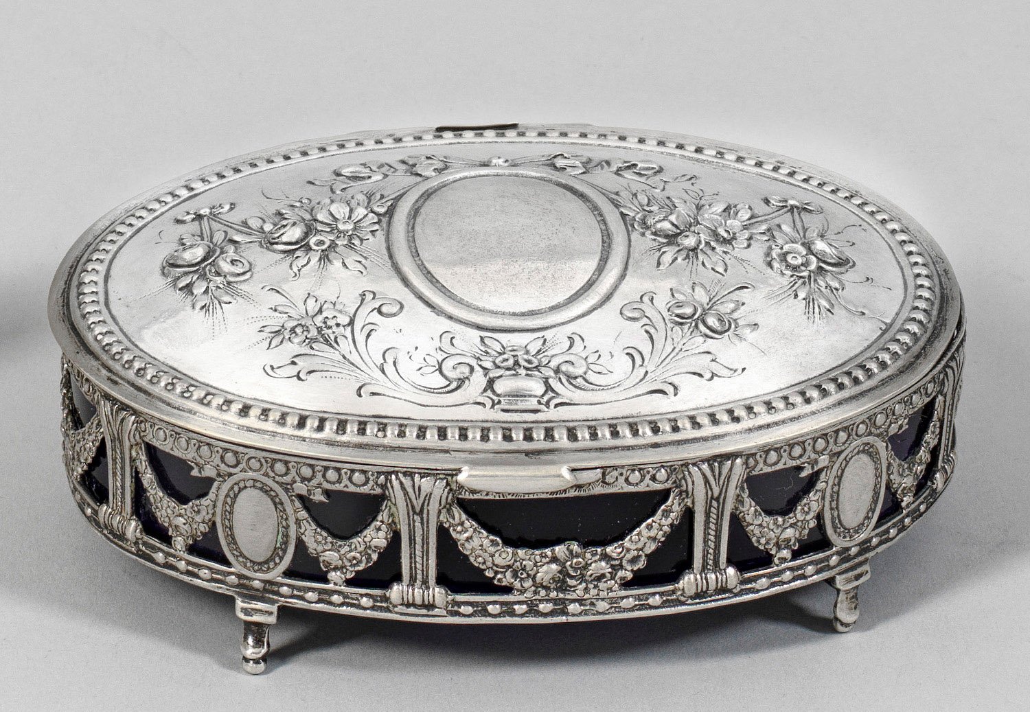 Schmuckschatulle Silber, blaues Glas. Ovale Form auf vier Füßen, Wandung durchbrochen gearbeitet und mit Festons und Medaillons verziert, auf dem Deckel Schleifenmedaillon, umgeben von Blumenrelief. Gest. 800. B. 13 cm.