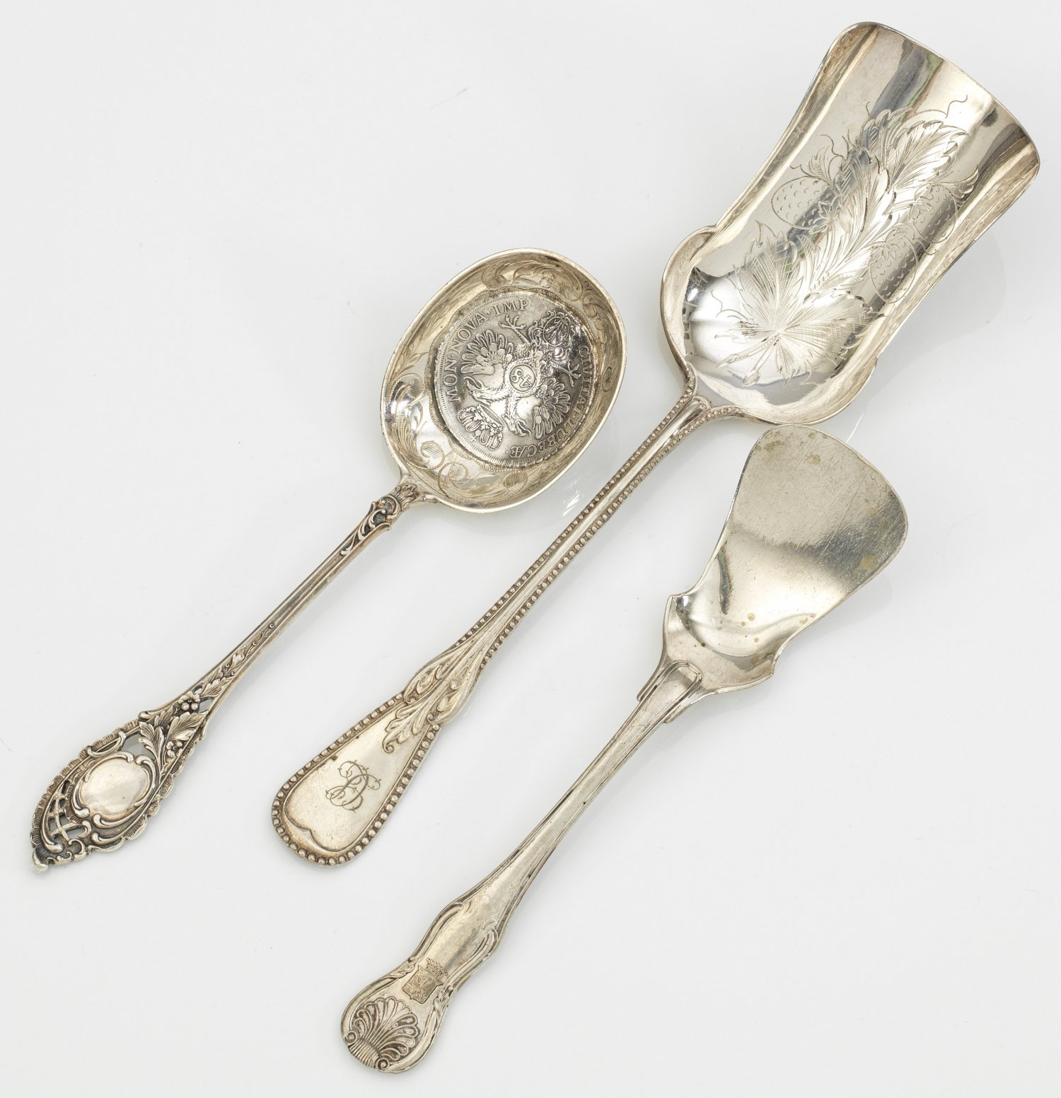 Konvolut Vorlege- und Münzlöffel 3-tlg.; Silber. Seltener Münzlöffel, in die Laffe eingearbeitet eine Lübecker 48-Schilling-Silbermünze von 1752, großer Vorlegelöffel (Hamburg um 1870), kleiner Vorlegelöffel (gest. 750). Gest. Garantiestempel, Herstellerzeichen. Gew. zus. ca. 200 g. L. 17,5 cm - 23,5 cm.