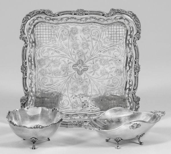 Tablett und zwei Schalen Silber. Tablett mit vielfach geschweiftem Blüten-Reliefrand, die Kehle in floraler Durchbrucharbeit, im Spiegel großes, zentriertes, graviertes Blumenarrangement. Die Schalen auf Blattfüßen, glatte Wandung mit Reliefmustern sparsam akzentuiert. Gest. 800. Gew. zus. ca. 990 g. 12,5 cm - 27 cm.
