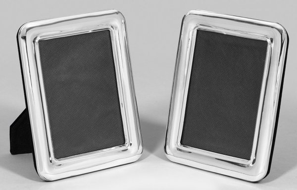 Paar Tischbilderrahmen Rechteckige, glatte Form mit gerundeten Ecken und profilierter Blende. Rückseitig aufstellbar. Gest. 925. 18,5 cm x 14,3 cm. Bildausschnitt 9,5 cm x 14 cm.