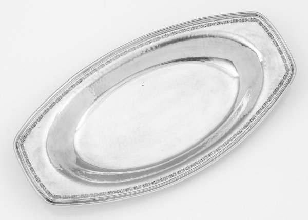 Brotschale Silber. Oval, mit leicht gemuldetem Spiegel und Hammerschlagdekor. Profilierter Rand, gerahmt von stilisiertem Blütenfries. Gest. Sterling, Herstellerzeichen. Gew. ca. 255 g. H. 3 cm. 31,5 cm x 17 cm.
