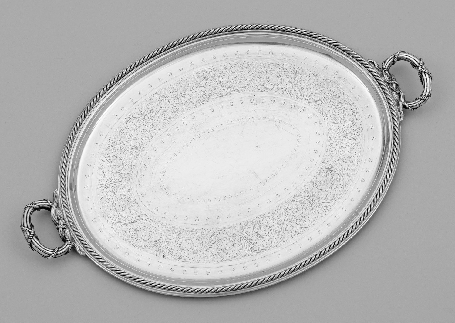 Viktorianisches Tablett Versilbert. Ovale Form, Rand und Handhaben mit plastischem Kordel-Motiv besetzt. Im Spiegel breiter, floral ausgeformter Wellenmäander. Gest. Herstellerzeichen, Jahresbuchstabe. B. 44,5 cm.