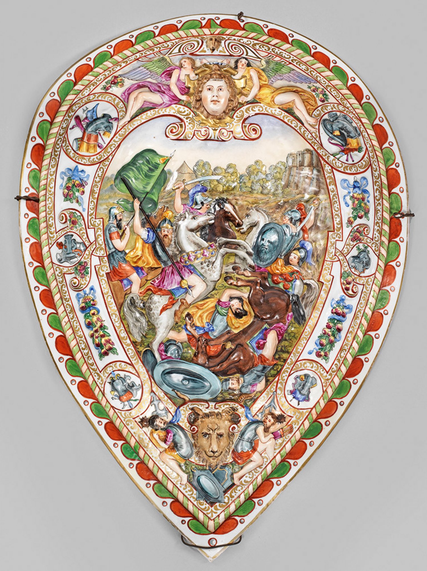 Großes Porzellanschild Gewölbte Tropfenform. Stark reliefplastischer Dekor. In reich ornamentierter Rahmung flächendeckende Schlachtenszene. Polychrome Malerei mit Goldornamentik. Rest.; Manufakturmarke. 58,5 cm x 42 cm.