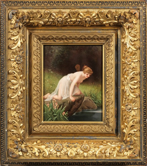 Rechteckige Bildplatte mit Darstellung der Psyche, an felsigem Ufer kniend und ihr Spiegelbild im Wasser betrachtend. Nach einem Gemälde von Friedrich Paul Thumann (1834 - 1908). Äußerst feine polychrome Malerei. Eingepresste Zepter- und KPM-Marke. Rücks. bez. sowie Klebeetikett mit Inv.-Nr.; Aufwändig gestalteter und vergoldeter Historismus-Stuckrahmen, verziert mit feinem, reliefplastischem Blüten- und Blattdekor sowie verschiedenen Ornamentbordüren. Platte 25 cm x 19 cm. 50,5 cm x 45,5 cm.