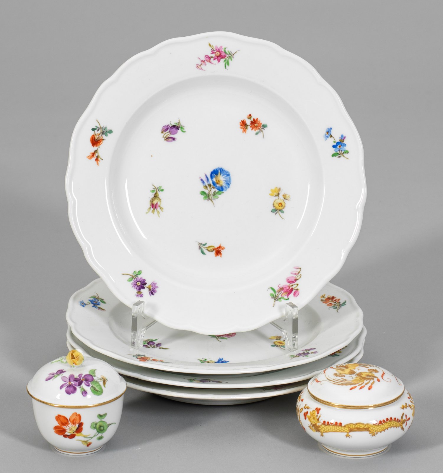 Vier Kuchenteller und zwei Deckeldöschen Farbiger Dekor aus gestreuten Blüten und "Reicher Drache"-Motiv in feiner, teilw. Gold gehöhter, polychromer Malerei. Teilw. Goldrand. Schwertermarke. H. 5 cm - 7 cm.