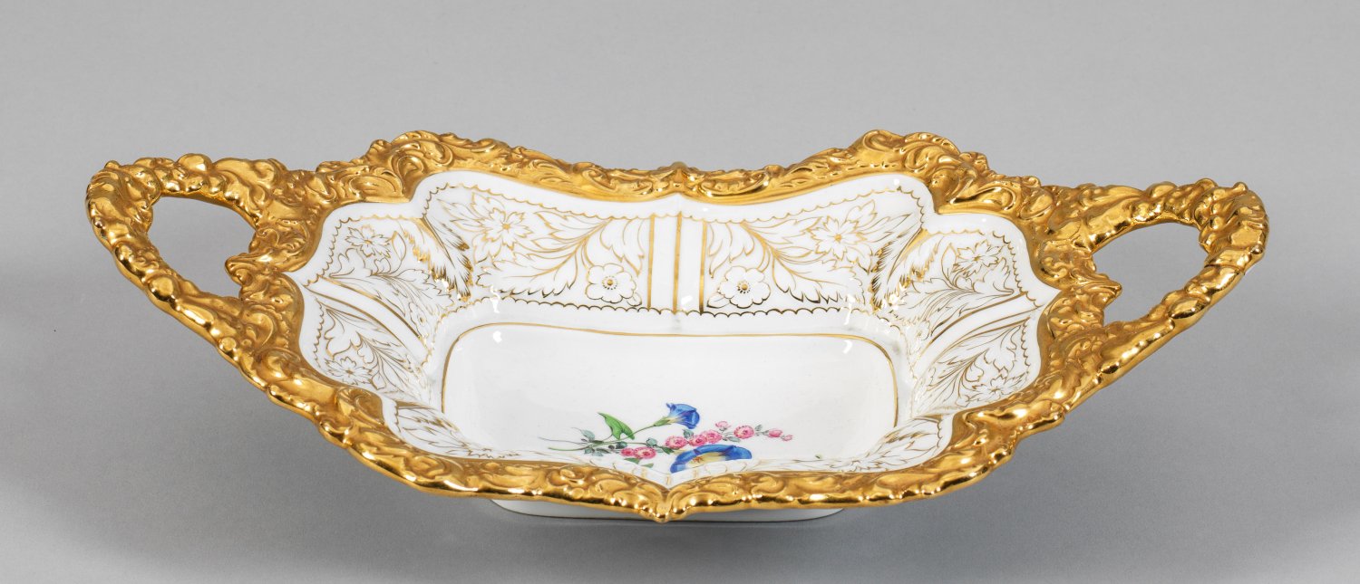 Prunkschale mit Blumendekor Rechteckiger, tief gemuldeter Korpus mit durchbrochen gearbeiteten Henkeln. Reicher, goldstaffierter Reliefdekor aus Rocaillen und stilisierten Blüten und Blättern. Im Spiegel feine polychrome Blumenmalerei. Schwertermarke. H. 9 cm. 35 cm x 21 cm.