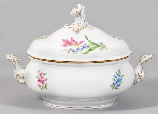 Deckelterrine mit Blumendekor Ovaler, gedrückt bauchiger Korpus. Gewölbt ansteigender Deckel, mittig gedrehter Blattvolutenknauf. Auf der Wandung und dem Deckel farbenprächtige Blumenmalerei. Goldstaffage. Schwertermarke. H. 24,5 cm. 36 cm x 23 cm.