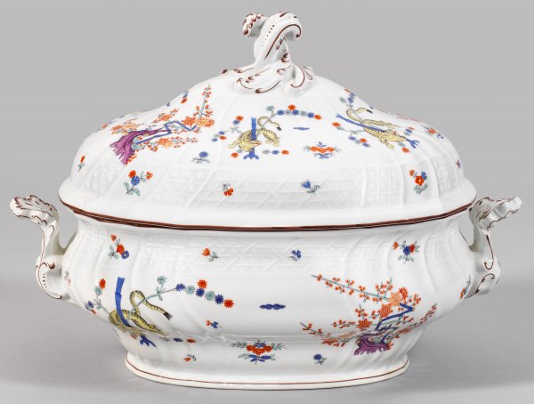 Deckelterrine mit Dekor "Gelber Löwe" Ovaler, gedrückt bauchiger Korpus. Gewölbt ansteigender Deckel, mittig gedrehter Blattvolutenknauf. Reliefdekor "Neubrandenstein". Auf der Wandung und dem Deckel Dekor "Gelber Löwe" (bzw. "Alter reicher gelber Löwe") umgeben von asiatischen Blumen in polychromer Malerei. Minim. Glasurfehler. Schwertermarke. H. 27 cm. 38 cm x 24 cm.