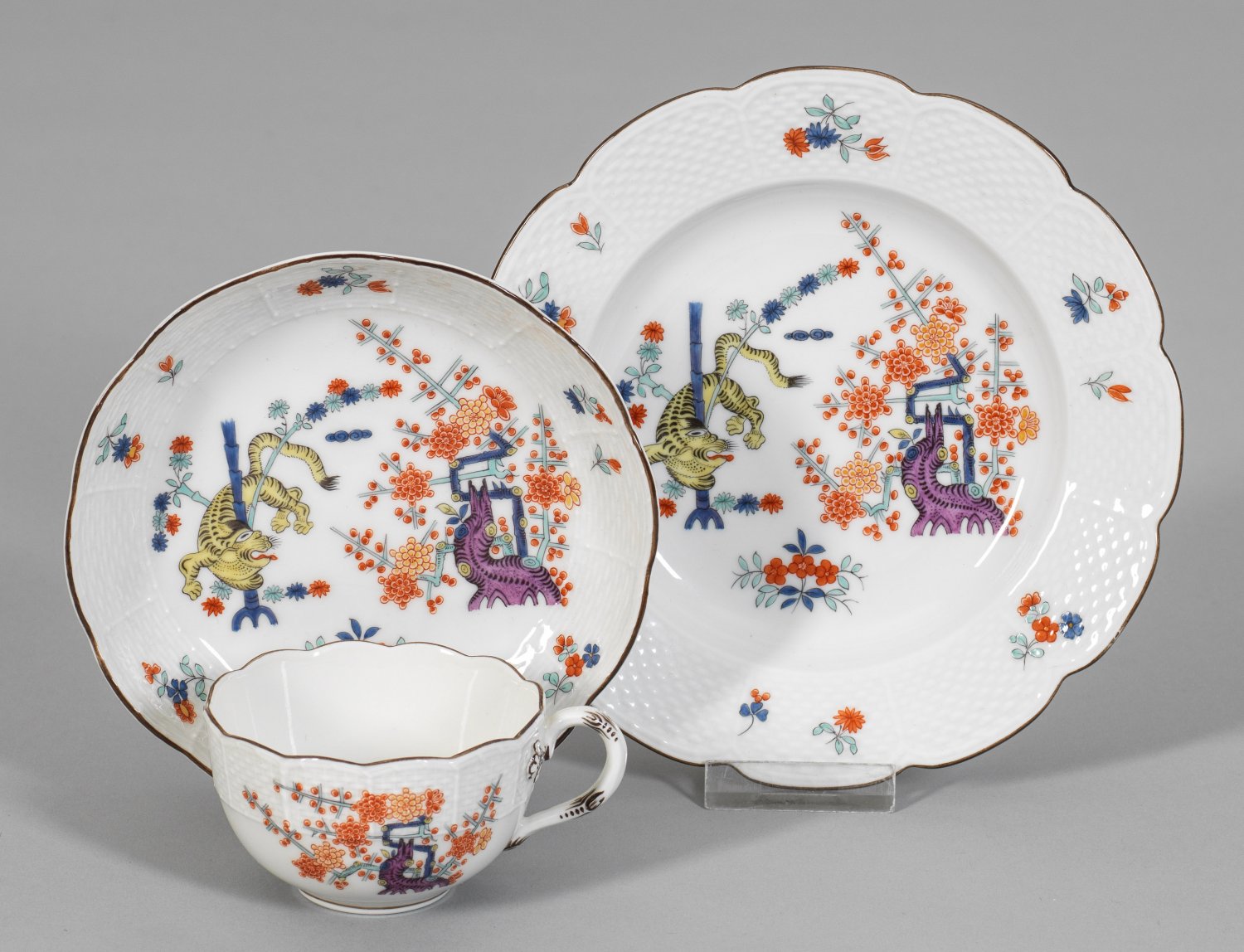 Mokka-Gedeck mit Dekor "Gelber Löwe" 3-tlg.; Mokkatasse mit Untertasse und Teller. Reliefdekor "Ozier". Dekor "Gelber Löwe" (bzw. "Alter reicher gelber Löwe") in polychromer Malerei. Schwertermarke. D. 12 cm - 15,5 cm.
