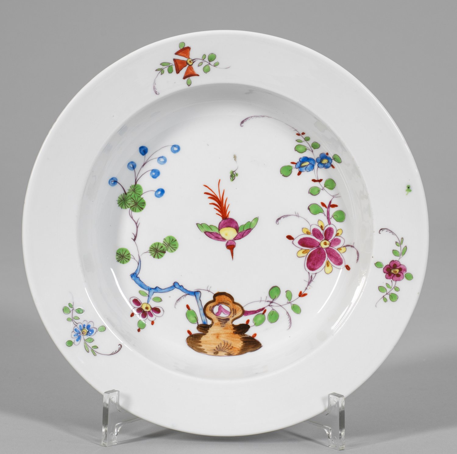 Zierteller mit Fels- und Vogeldekor Runde, gemuldete Form. Im Spiegel stilisierter Fels- und Vogeldekor, auf der Fahne gestreute Blüten nach ostasiatischem Vorbild in polychromer Malerei. Schwertermarke. D. 23,5 cm.