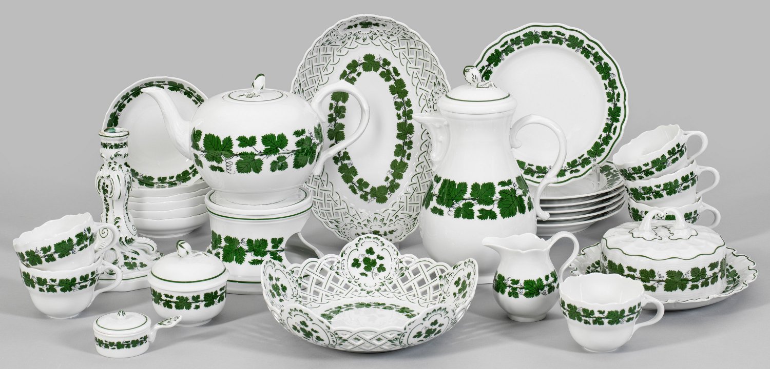 Kaffee- und Teeservice mit Weinlaubdekor 22-tlg.; Kaffee- und Teekanne, Zuckerdose, Sahnegießer, 6 Kaffeetassen mit Untertassen, 6 Kuchenteller, Kerzenhalter, Stövchen mit Lämpchen, 2 Anbietschalen, Butterdose. Weinlaubdekor in unterglasurgrüner Malerei. Minim. best.; Schwertermarke. Kannen-H. 15 cm - 24 cm.