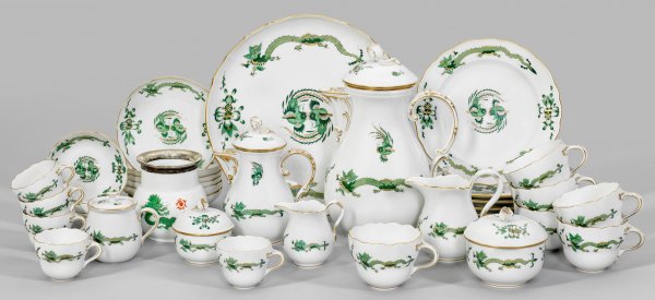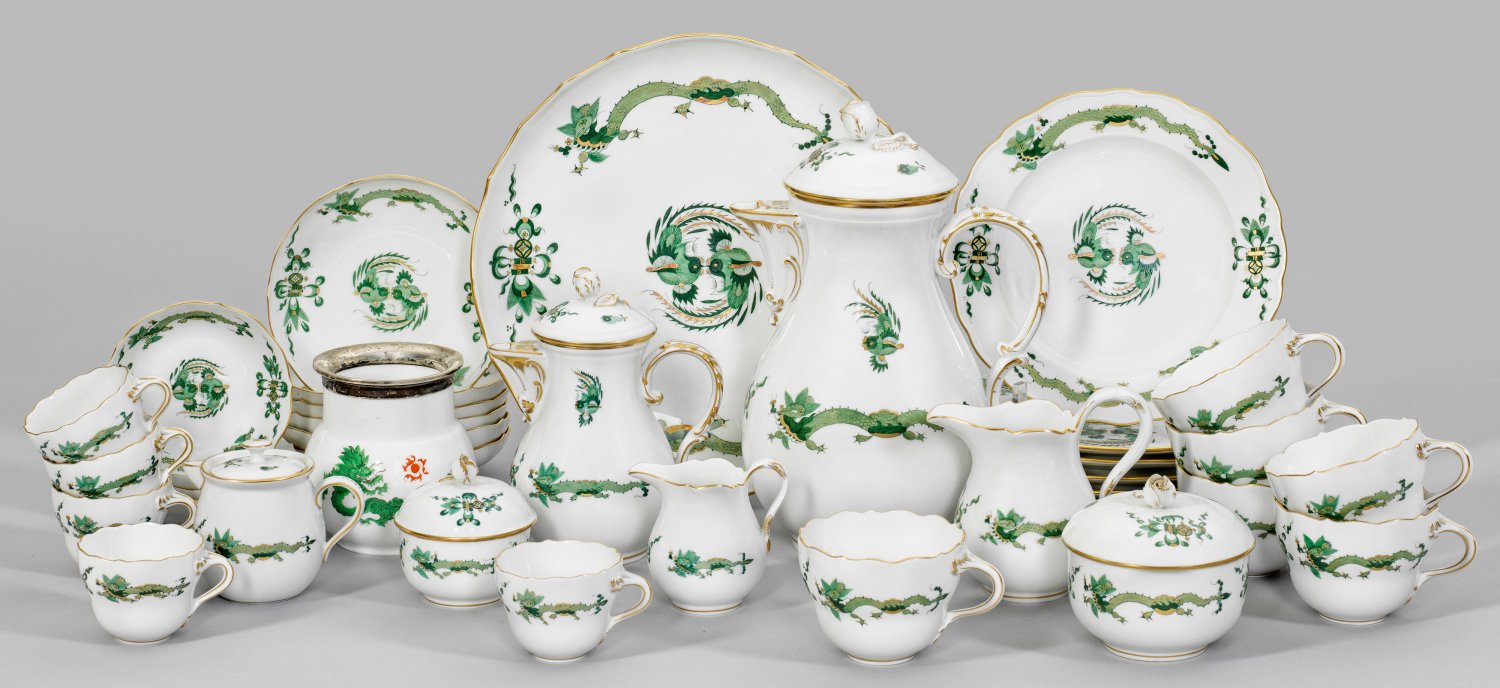 Mokka- und Kaffeeservice mit Dekor "Reicher Drache" 26-tlg.; Kaffee-, Mokkakanne, 3 Sahnegießer, 2 Zuckerdosen, 6 Kaffee-, 4 Mokkatassen mit Untertassen, 6 Kuchenteller, Tafelaufsatz und Gebäckschale. Dekor "Reicher Drache" in Grün. Polychrome Malerei mit Goldstaffage. Beigabe: Mokkatasse, Vase mit Dekor "Mingdrache" und 800er Silbermontierung. Teilw. unw. best.; Schwertermarke. Kannen-H. 16,5 cm - 25,5 cm.