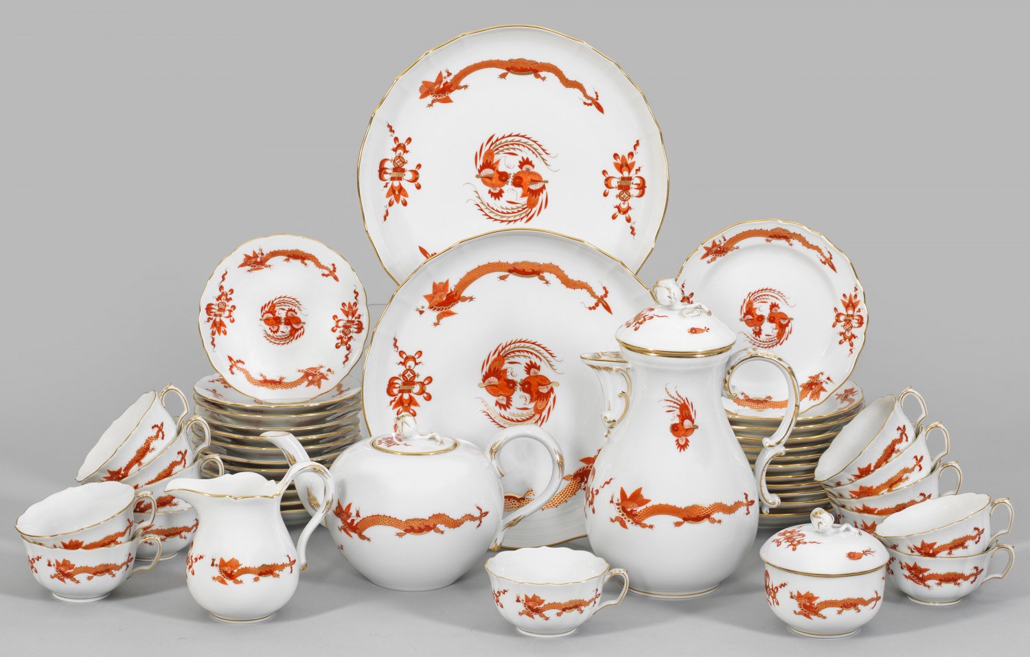 Teeservice mit eisenrotem Dekor "Reicher Drache" 30-tlg.; Tee-, Kaffeekanne, Zuckerdose, Sahnegießer, 12 Teetassen mit Untertassen, 12 Kuchenteller, 2 Kuchenplatten. Dekor "Reicher Drache" in eisenroter, Gold gehöhter Camaieumalerei. Minim. best.; Haarriss. Schwertermarke. Kannen-H. 14 cm - 18 cm. Teller-D. 18 cm.
