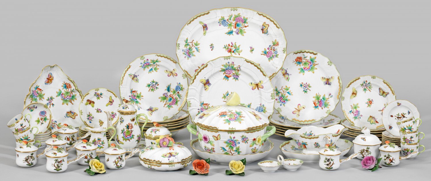 Speise- und Mokkaservice "Victoria" und "Rothschild-Vogel" 63-tlg.; Mokkakanne, 2 Zuckerdosen, Sahnegießer, 6 Tassen mit Untertassen, 6 Speise-, 6 Suppen-, 6 Brot-, 6 Kuchenteller, Deckelterrine, 2 Anbietplatten, 2 Beilagenschalen, Sauciere und Presentoir, Bonbonniere, Gewürzschälchen, 8 Cremetöpfchen, 8 Brotteller, 4 plastische Rosen als Tafeldekoration. "Altozier" bzw. "Neuozier"-Reliefdekor. Auf der Wandung und im Spiegel farbenprächtiger Dekor "Victoria" aus Päonienzweigen und Schmetterlingen sowie dem "Rothschild-Vogel"-Muster aus naturalistisch gestalteten, auf Ästen sitzenden Vogelpaaren. Polychrome Malerei mit Umdruck. Goldstaffage. Minim. best.; Manufakturmarke. Terrinenmaße 29 cm x 23 cm.