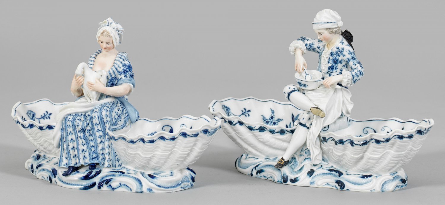 Paar große figurale Gewürzschalen als Tafeldekoration Gegenstücke. Über rocaillereliefiertem Sockel, zwischen zwei tief gemuldeten Muschelschalen sitzende Köchin bzw. Koch in gemusterter Kleidung, eine Gans rupfend und eine Speise rührend. Auf der Innenwandung feiner Zwiebelmusterdekor. Unterglasurblaue und polychrome Malerei. Teilw. minim. rest.; Schwertermarke. H. 16 cm - 17 cm. 25 cm x 11 cm.