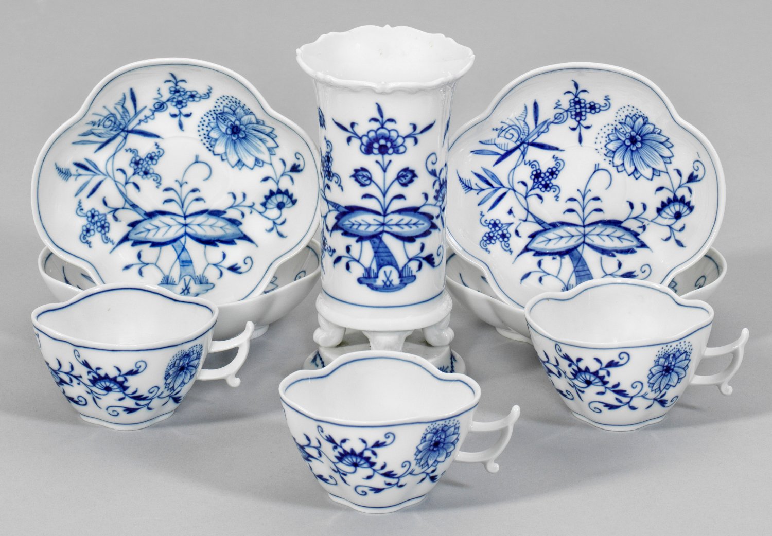 Lot 2333: Drei Mokkatassen und Vase mit Zwiebelmusterdekor