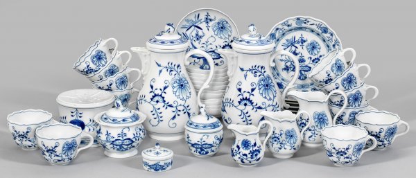 Kaffeeservice mit Zwiebelmusterdekor für sechs Personen. 25-tlg.; 2 Kaffeekannen, 2 Zuckerdosen, 2 Sahnegießer, 12 Tassen mit Untertassen, 6 kleine Kuchenteller, Stövchen. Zwiebelmusterdekor in unterglasurblauer Malerei. Minim. best.; Haarriss. Schwertermarke. Beigabe: Sahnegießer, Hutschenreuther. Kannen-H. 24 cm. Teller-D. 18 cm.