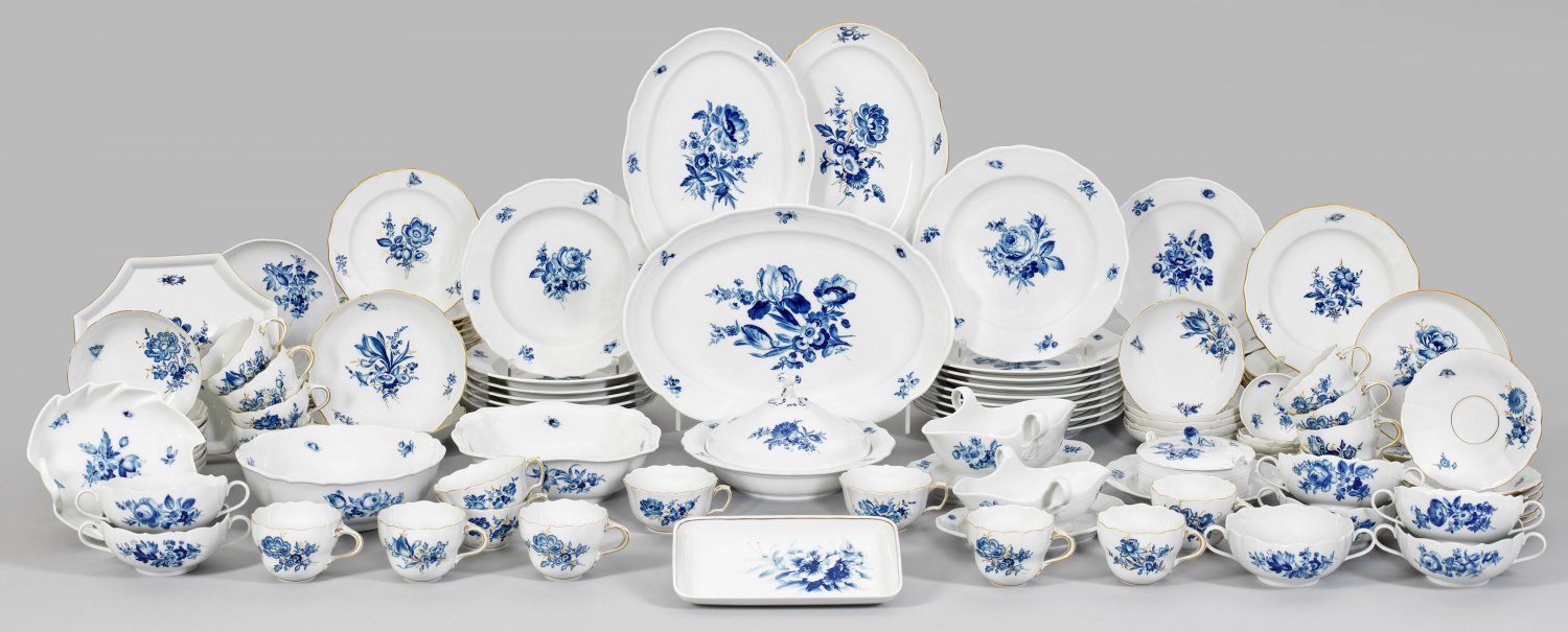 Kaffee- und Speiserestservice mit Dekor "Blaue Blume" 81-tlg.; 13 Kaffee-, 4 Tee-, 7 Suppentassen mit Untertassen, 9 Vorspeisen-, 9 Speise-, 6 Suppen-, 9 Kuchen-, 5 Dessertteller, 2 Saucieren, 3 Anbietplatten, Gemüsenapf, 2 Beilagen-, 3 Gebäckschalen, Butterdose, 6 Salzschälchen, Tablett. Dekor "Blaue Blume" in unterglasurblauer Malerei sowie Aquatinta. Beigabe: kleines Tablett. Schwertermarke. Gemüsenapf-D. 33 cm. Plattenmaße 22 cm x 30 - 37 cm.