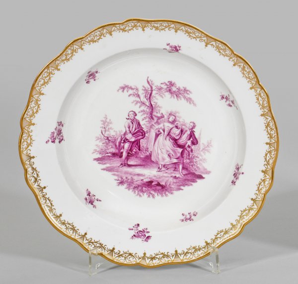 Große Zierschale mit Watteauszenen Runde Form mit geschweiftem Rand. Im vertieften Spiegel szenische Darstellung eines tanzenden Paares mit Drehleierspieler, umgeben von gestreuten Blumengebinden in purpurfarbener Camaieumalerei. Umlaufend breite Goldspitzenbordüre. Produktionsbedingte Best.; Schwertermarke. D. 30 cm.