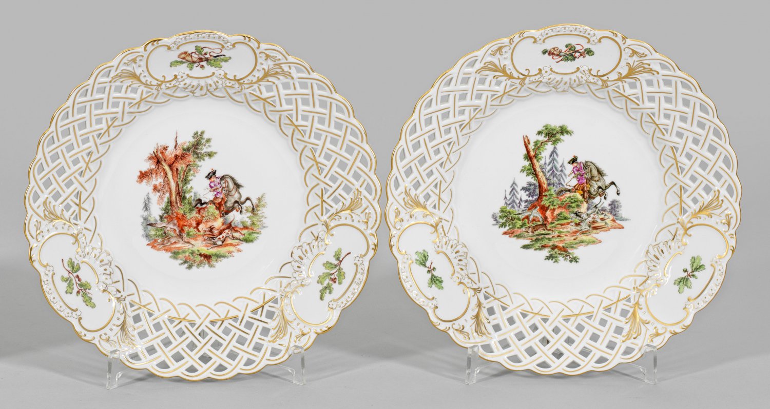 Paar Zierteller mit Jagdmotiven nach Ridinger Runde Form. Korbgeflechtartig durchbrochen gearbeiteter Rand im Wechsel mit goldkonturierten Rocaillekartuschen, darin jagdliche Motive. Im vertieften Spiegel Jagdszenen nach J. E. Ridinger in feiner polychromer Malerei. Schwertermarke. D. 29 cm.