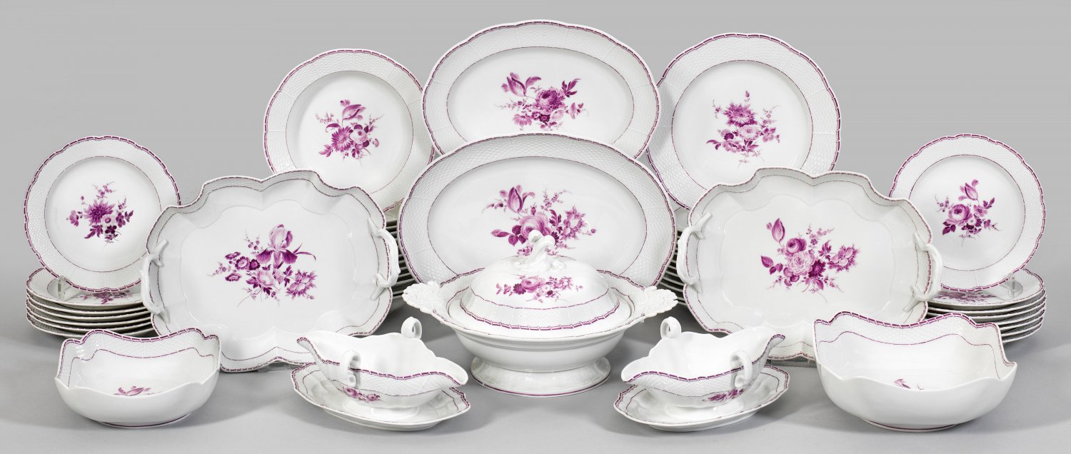Speiseservice mit purpurfarbenem Blumendekor 50-tlg.; 13 Speise-, 13 Suppen-, 15 Dessertteller, Gemüseterrine, 2 Saucieren, 2 Henkel-, 2 Beilagenschalen, 2 Anbietplatten. Umlaufender staffierter Ornamentrand mit Reliefdekor "Altozier". Auf der Wandung und im Spiegel feiner Dekor aus sommerlichen Blumengebinden in purpurfarbener Camaieumalerei. Schwertermarke. Plattenmaße 22 cm - 31 cm x 26 cm - 36 cm. Terrine 34 cm x 28 cm.