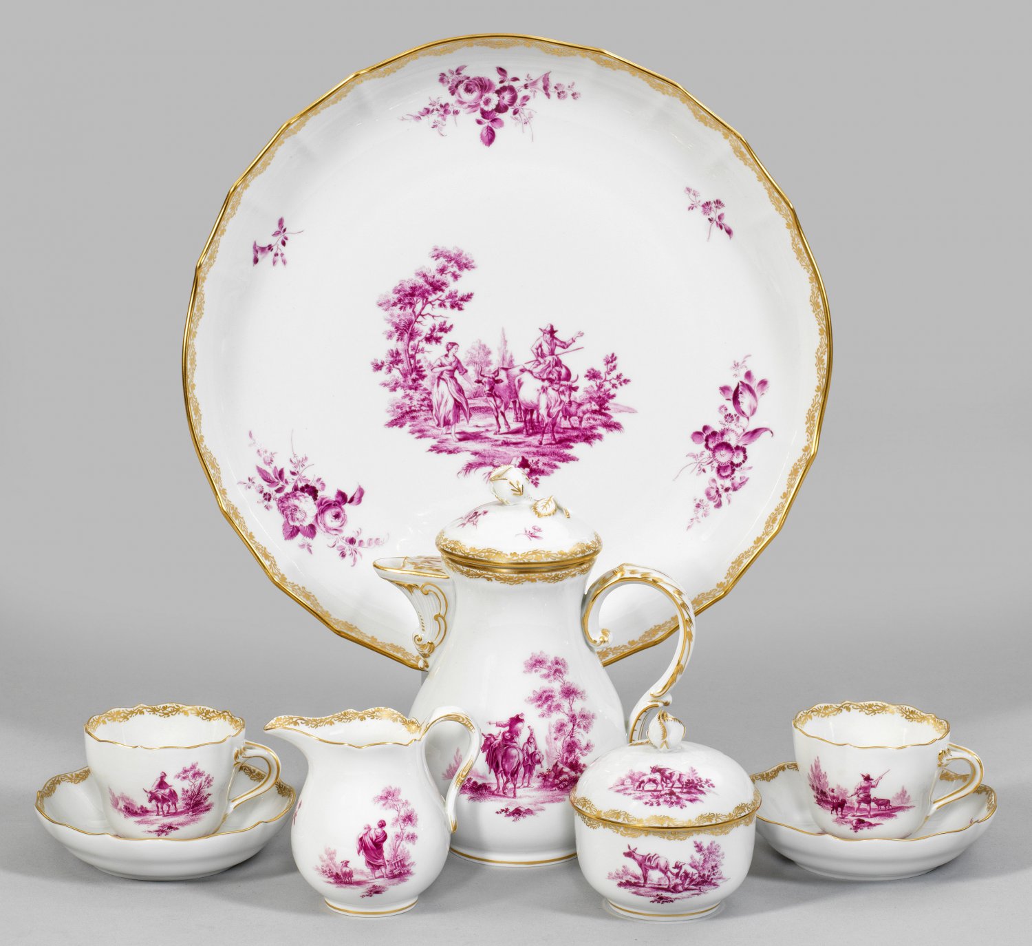 Mokka-Dejeuner mit purpurfarbenem Dekor nach Berchem 6-tlg.; Mokkakanne, Sahnegießer, Zuckerdose, 2 Tassen mit Untertassen, Tablett. Auf der Wandung und im Spiegel figürliche Szenen sowie Tier- und Blumendarstellungen nach Nicolaes Berchem in feiner, purpurfarbener Camaieumalerei. Umlaufende Goldornamentbordüre. Schwertermarke. Kannen-H. 16 cm. Tablett-D. 28 cm.