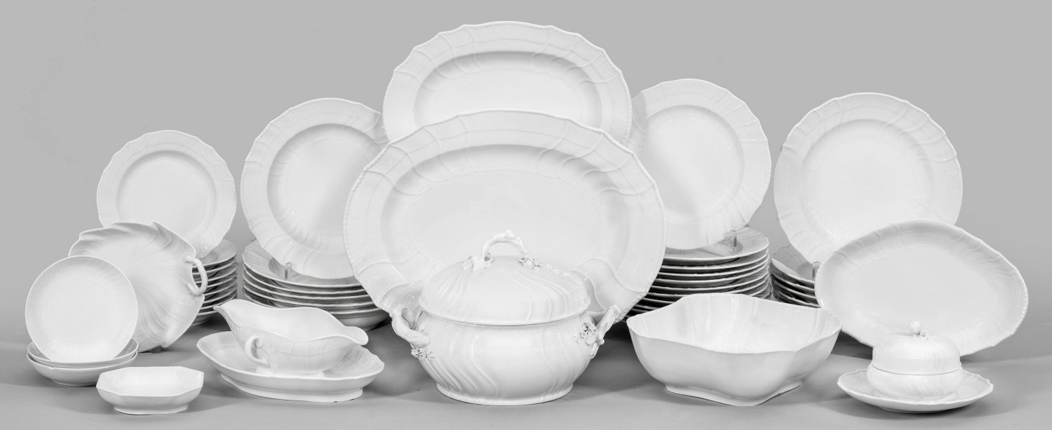 45-tlg.; 6 Speise-, 6 Suppen-, 9 Brot-, 12 Dessertteller, Deckelterrine, Sauciere, Gebäck-, Konfekt- und 2 Beilagen-, 3 Dessertschalen, 2 Anbietplatten, Butterdose. Reliefdekor mit feinem Blatt- und Rankenwerk. Unw. best.; Zeptermarke. Plattenmaße 23 cm - 31 cm x 31,5 x 40 cm. Terrinen-D. 23 cm.