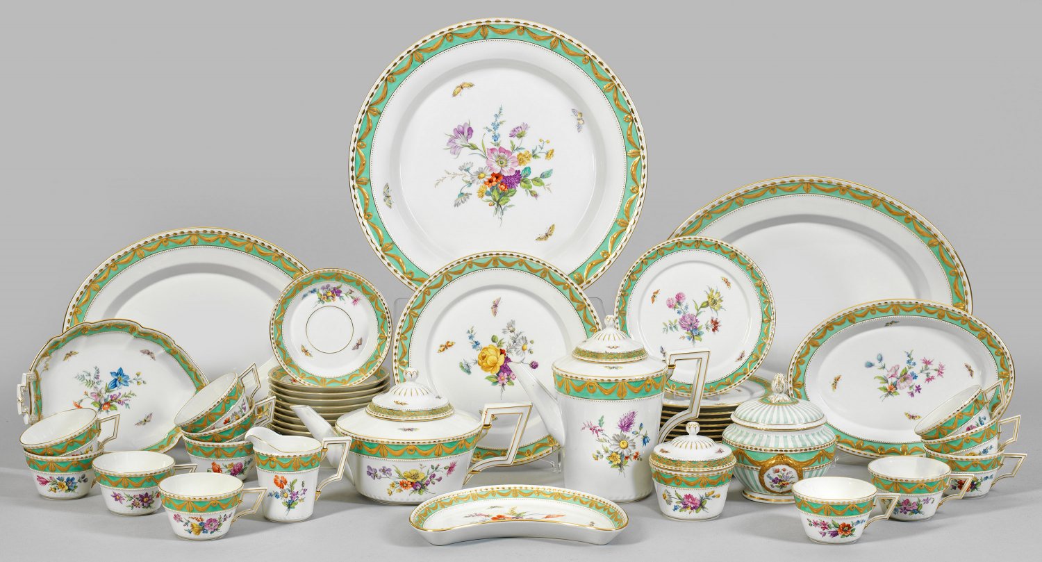 Prächtiges Kaffeeservice "Kurland" mit Blumendekor für zwölf Personen. 36-tlg.; Kaffee-, Teekanne, 2 Zuckerdosen, Sahnegießer, 12 Tassen mit Untertassen, 12 Kuchenteller, 5 Anbietplatten, 2 Gebäckschalen. Klassizistische Form "Kurland" mit goldradiertem Rand aus Eierstabbordüre und Tuchgehänge auf seegrünem Fond. Auf der Wandung und dem Spiegel farbenprächtiger Dekor aus verschiedenden, sommerlichen Blumengebinden in feiner polychromer Malerei. Zepter- und Malereimarke. Kannen-H. 16 cm - 21 cm. Platten-D. 36 cm. Plattenmaße 27 - 42 cm x 20 cm - 33 cm.