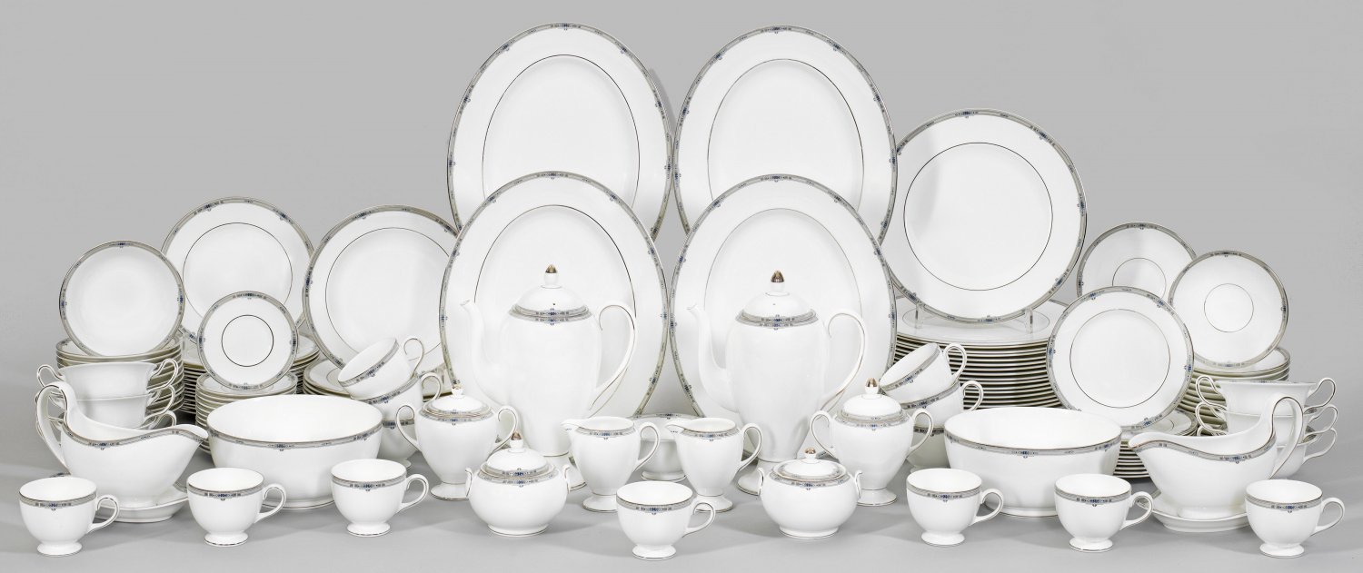 Kaffee- und Speiseservice "Amherst" 120-tlg.; 2 Kaffeekannen, 4 Zuckerdosen, 2 Sahnegießer, 13 Kaffee-, 7 Suppentassen mit Untertassen, 14 Mokka-Untertassen, 25 Menüteller, 8 Suppen-, 11 Brot-, 14 Kuchenteller, 2 Saucieren mit Presentoir, 2 Beilagenschalen, 4 Anbietplatten, 12 Dessertschalen. Dekor "Amherst" mit grauer Ornamentbordüre und Platinstaffage. Manufakturmarke. Kannen-H. 26 cm. Plattenmaß 36 cm x 28 cm. Teller-D. 18 cm - 27 cm.