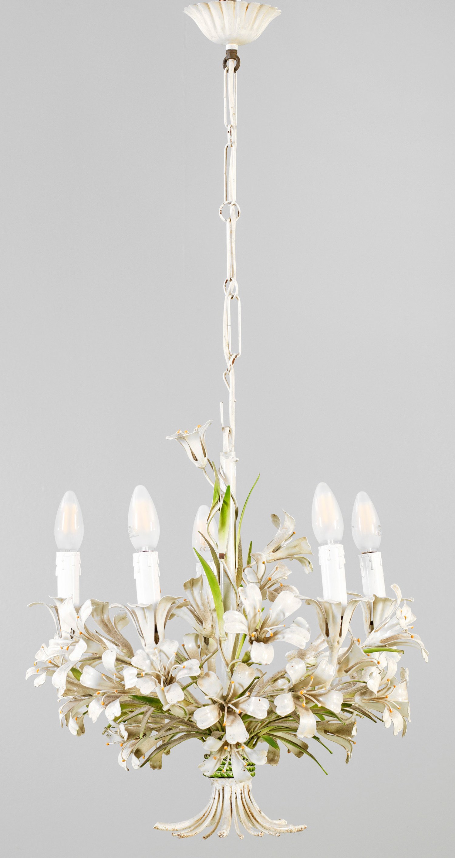 Deckenleuchter 5-flg.; Metall, elfenbeinfarben und hellgrün lackiert. Floral gestalteter Korpus aus gebündelten und gestaffelt angeordneten Blütenmotiven sowie gebogten Leuchterarmen. Kettenaufhängung. Elektrifiziert. Lampen-H. 48 cm. D. 45 cm.