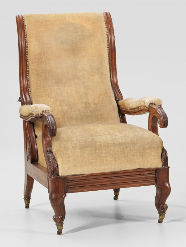 Viktorianischer Kaminsessel Mahagoni. Trapezförmige Zarge auf volutenförmigen Beinen mit Rollen. Geschwungene, blattreliefierte Streben für schmale Armlehnen aus Voluten. Hohe, leicht zurückschwingende und verstellbare Rückenlehne. Allseitig gepolstert und bezogen. H. 103 cm. 67 cm x 74 cm. Sitz-H. 46 cm.
