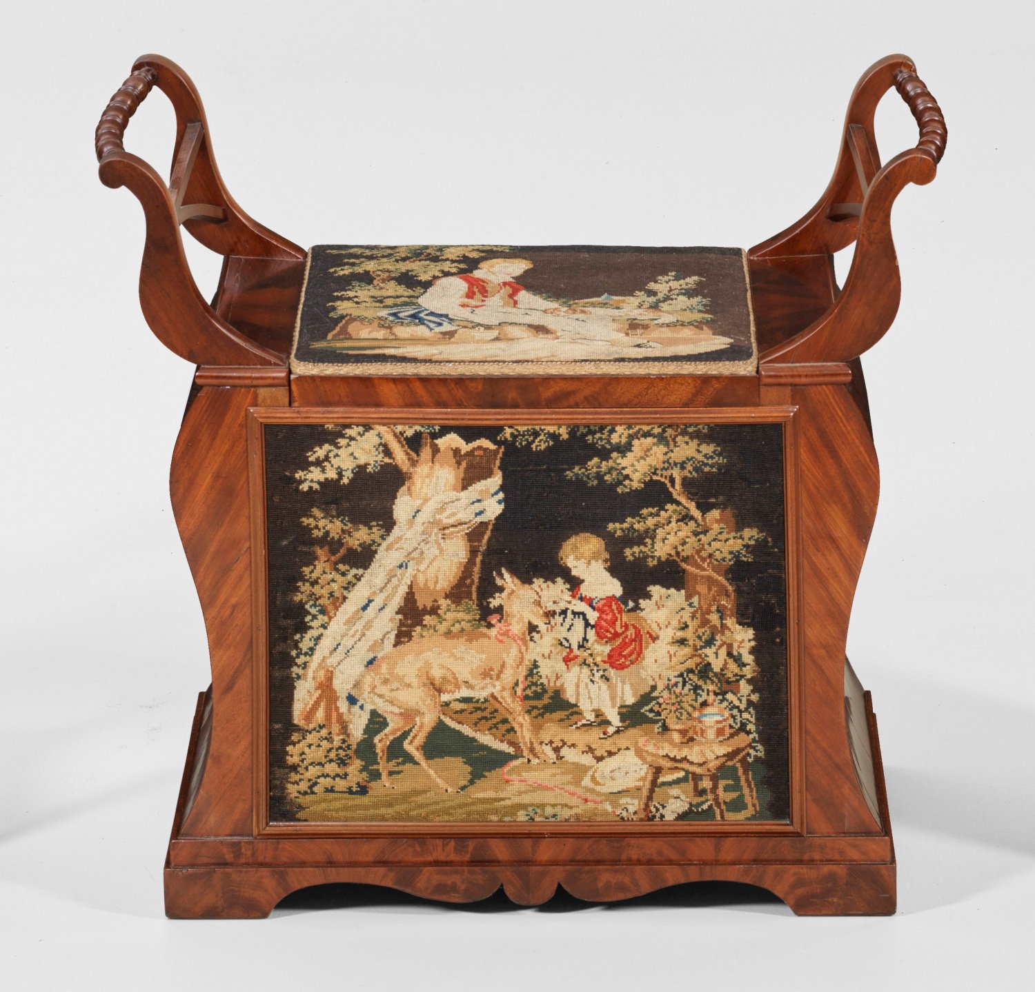 Kleine Biedermeier-Truhenbank Mahagoni, furniert. Gerader, seitlich bombierter Korpus auf schmaler Zarge. Geschweift ansteigende Stützen für schmale Armlehnen aus gebogten Balusterstäben. Schauseite und Stitzfläche mit szenisch angelegter Petit Point-Stickerei. H. 72 cm. 79 cm x 35 cm.