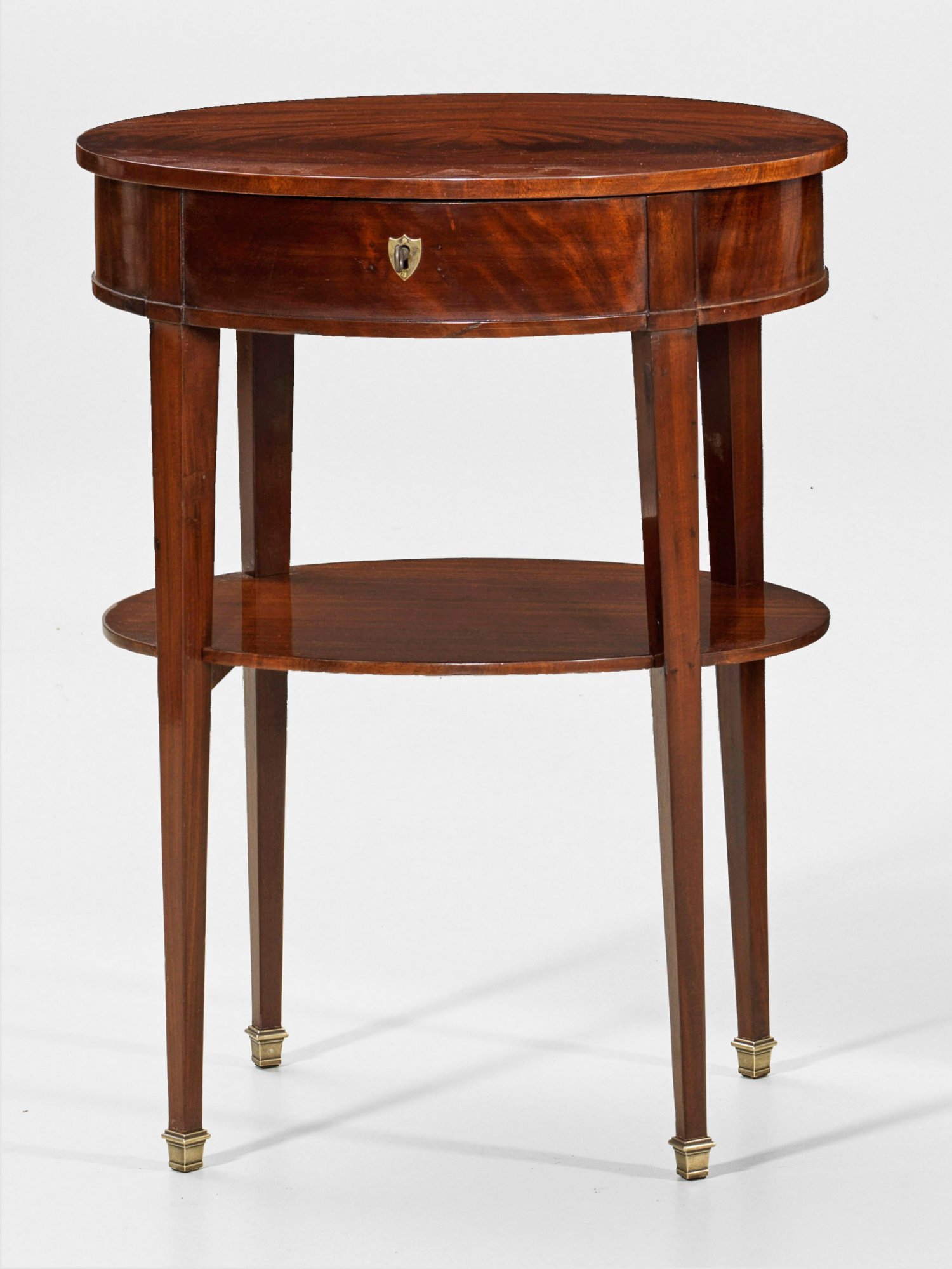 Biedermeier-Nähtisch Mahagoni, furniert. Bombierter Zargenkasten auf konischen Vierkantbeinen, unterhalb durch ovales Ablagefach verbunden. Gering überstehende, aufklappbare Deckplatte. Unterhalb Facheinteilung. Rest. mit Erg.; H. 74 cm. 57 cm x 42,5 cm.