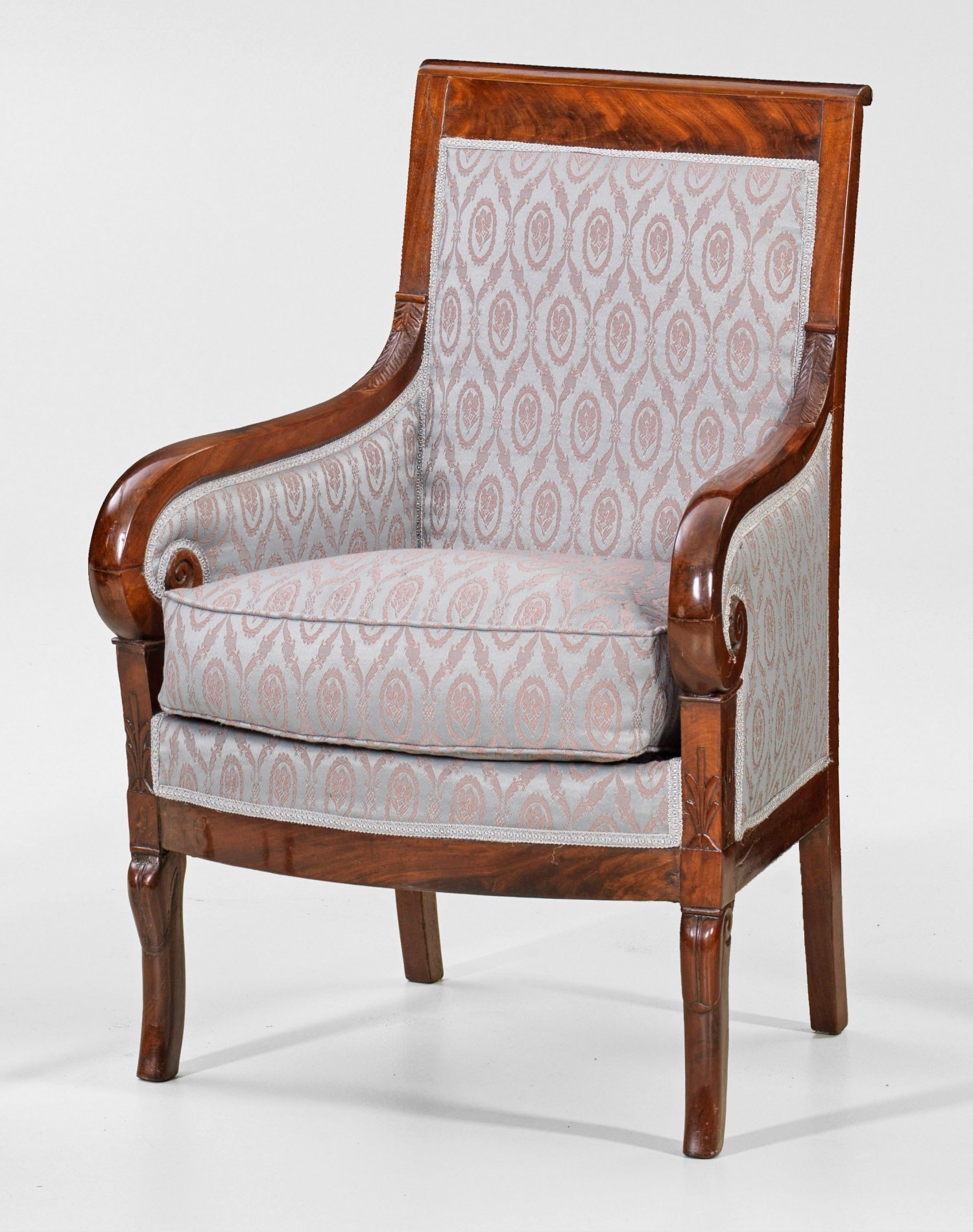Biedermeier-Bergère Mahagoni. Trapezförmige, leicht bombierte Zarge auf geschweiften Beinen. Kurze Stütze für volutenförmige Armlehnen sowie rechteckige Rückenlehnenrahmung. Allseitig gepolstert und bezogen. H. 93 cm. 65 cm x 60 cm. Sitz-H. 46 cm.