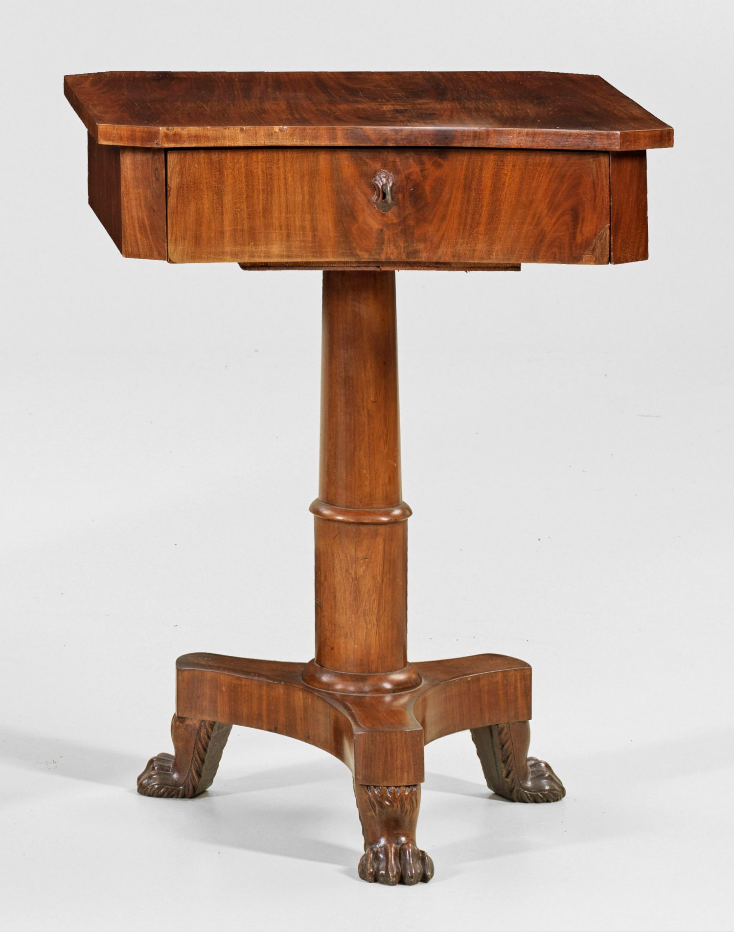 Biedermeier-Nähtisch Mahagoni, massiv und furniert. Konischer Schaft auf dreiseitig stark eingezogener Sockelplatte und reliefplastischen Tatzenfüßen als Träger für rechteckigen, einschübigen und schauseitig konkav eingezogenen Zargenkasten. Innen Facheinteilung. Korrespondierende Deckplatte. H. 78 cm. 60 cm x 47,5 cm.
