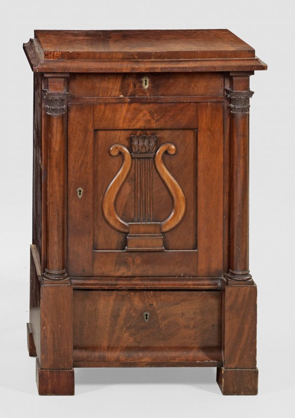 Biedermeier-Notenschrank Mahagoni, furniert. Gerader, architektonisch gegliederter Korpus, flankiert von eingestellten Vollsäulen mit reliefierten Kapitellen auf hohem, einschübigem Zargensockel. In der gegliederten Front Tür mit appliziertem Lyramotiv sowie schmales Schubfach. Gestuft ansteigende Deckplatte. Altersspuren. H. 94 cm. 64 cm x 46 cm.