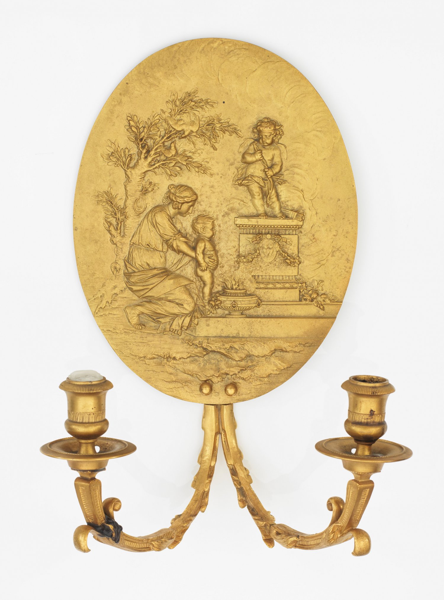Dekorative Wandapplike 2-flg.; Bronze, vergoldet. Hochovales Wandschild mir erhaben reliefierter Darstellung einer Mutter mit Kind vor einer Puttenskulptur. Unterhalb davon ausgehend zwei stark geschwungene Leuchterarme mit vasenförmigen Tüllen. H. 36 cm.