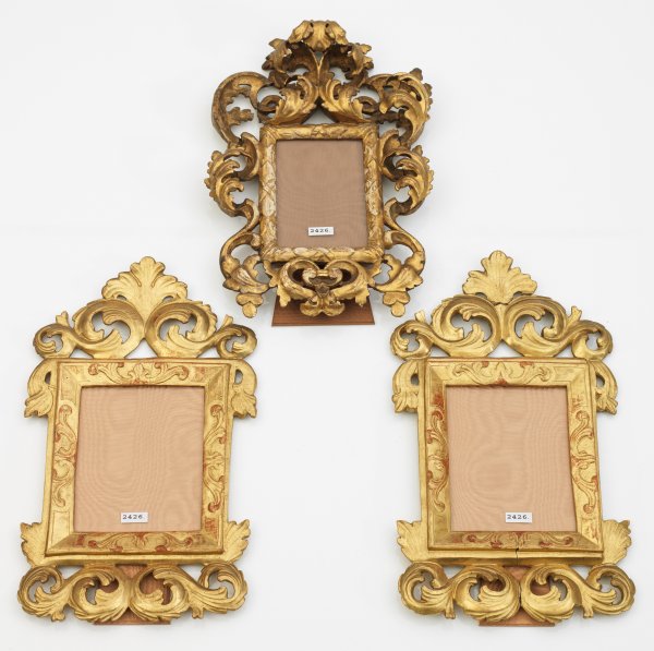 Drei Holzrahmen im Barock-Stil Holz, geschnitzt, gefasst und vergoldet. Hochrechteckige, profilierte Rahmung, umgeben von durchbrochen gearbeiteten, eingerollten Blattvoluten bzw. üppigem Muschelwerk, in korrespondierende, hochaufgeworfene Bekrönung übergehend. Rückseitig aufstellbar. Verglast. Teilw. besch. und ber.; 35 cm x 23,5 cm, Falzmaß 13,5 cm x 9 cm bzw. 38 cm x 22 cm, Falzmaß 15 cm x 12 cm.