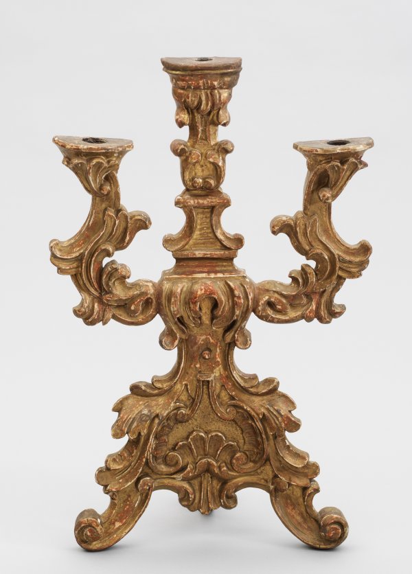 Süddeutscher Altarleuchter 3-flg.; Holz, geschnitzt, gefasst und vergoldet. Halbplastisch auf drei Beinen. Reliefiert geschnitzte Schauseite mit geschweift ansteigenden Voluten. Oberhalb in zwei Ebenen angeordnete Leuchter. Minim. best. und ber.; 54 cm x 34 cm.