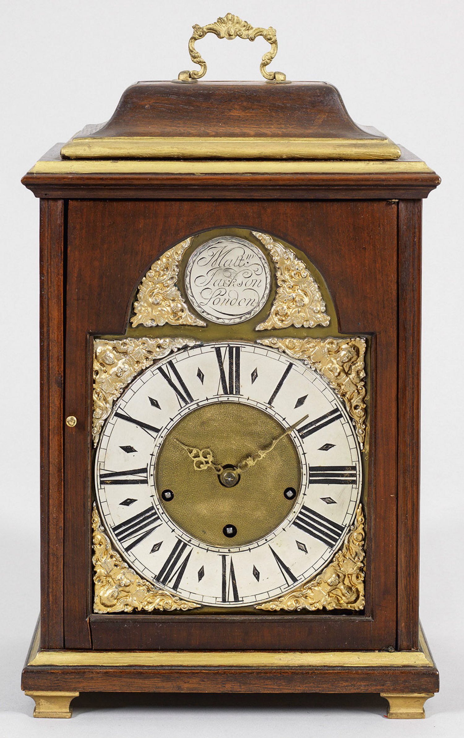 Stutzuhr Mahagoni. Gerades, rechteckiges Uhrengehäuse mit geschweift ansteigendem oberen Abschluss und aufstellbarem Griff. Verglastes Zifferblatt bez. Matt. Jackson London. Werk mit Ankerhemmung sowie Westminsterschlag auf Tonstäben. H. 52 cm. 31 cm x 22 cm.