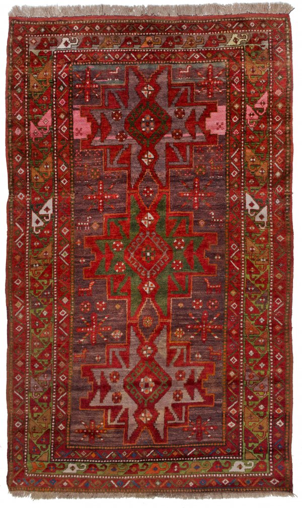 Brücke mit Kasak-Muster Aserbaidschan. 1. Hälfte 20. Jh.; Wolle auf Wolle. Auf auberginefarbenem, abraschiertem Fond drei große, sternförmige Rautenmotive sowie Dekor aus lose gestreuten Sternen und Rosetten. Umlaufend mehrteilige Ornamentbordüre in unterschiedlichen Rot- und Grüntönen. 257 cm x 156 cm.