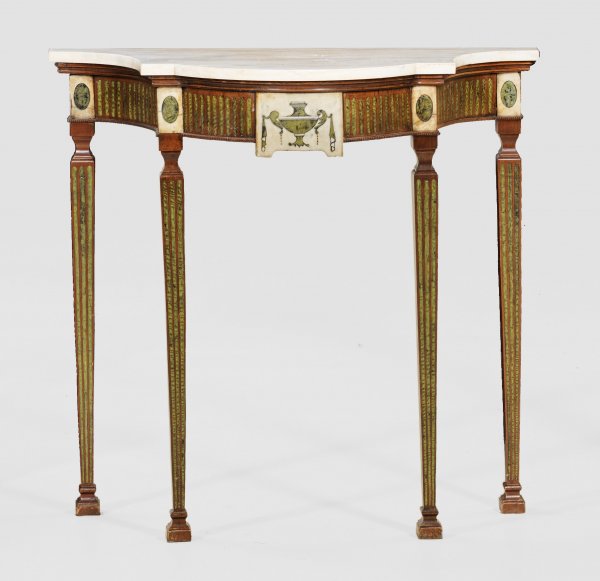 Edwardianischer Konsoltisch Mahagoni mit Einlagen aus grünem Lack sowie Alabaster und weißer Marmor. Bombierte, zu den Seiten konkav eingezogene Zarge auf hohen, gekanteten Balusterbeinen. In der Mitte Reserve mit Vasenmotiv. Korrespondierende, gering überstehende Deckplatte. H. 84,5 cm. 88,5 cm x 36 cm.
