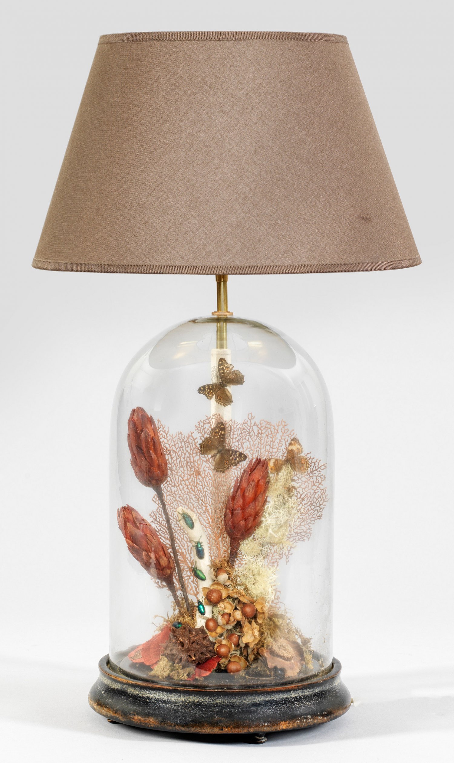 Extravagante Tischlampe 1-flg.; Korpus aus einer besch. Glasglocke mit Holzsockel als Träger für Leuchtmittel. Innen frei komponierte Assemblage aus Schriftrolle, Moos und unterschiedlichen der Natur entlehnten Materialien. Ovaler, konischer Lampenschirm. Elektrifiziert. H. 77 cm.