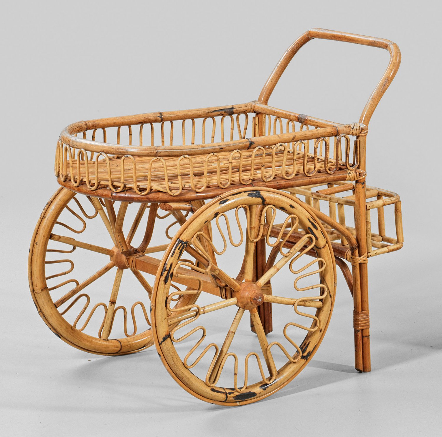 Mid Century-Barwagen Bambus. Korpus aus stark gebogten, mit Peddigrohr verbundenen Stäben auf großen Speichenrädern. Galeriegerahmte Abstellfläche sowie Halterung für vier Flaschen. Unbez.; H. 80 cm. 83 cm x 62 cm.