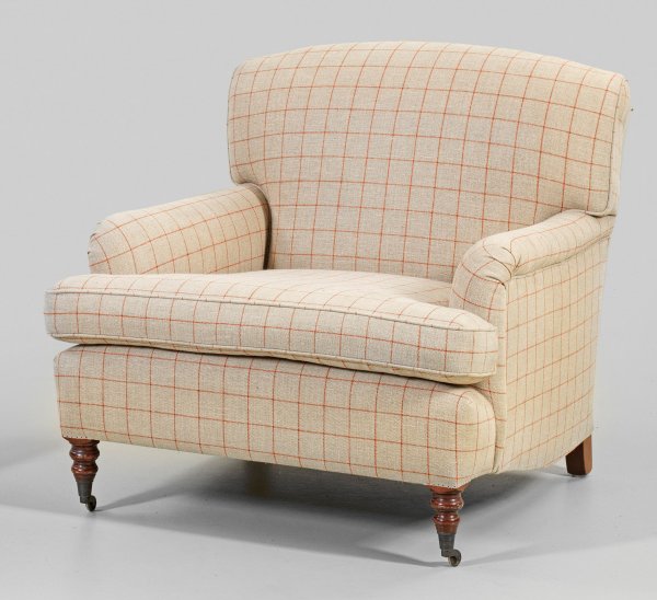 Großer Sessel Gerade Zarge auf balusterförmigen Mahagonifüßen mit Rollen. Niedrige, gerundete Armlehnen sowie korrespondierende Rückenlehne. Sitzfläche mit losem Polsterkissen. Allseitig gepolstert und bezogen. H. 90 cm. 93 cm x 100 cm. Sitz-H. 46 cm.