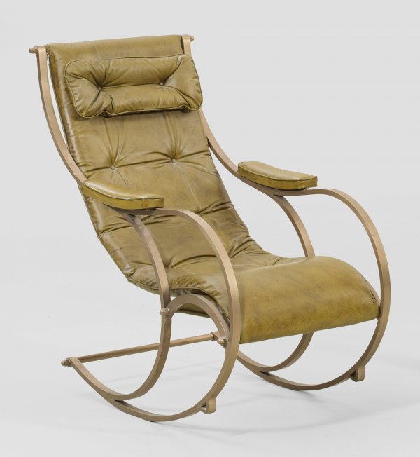 Schaukelstuhl in der Art von Peter Cooper Metall, messingfarben patiniert sowie olivgrünes Kunstleder. Gestell aus stark geschwungenen und ineinander verschraubten Streben als Träger für Sitz- und Lehnenfläche mit Knopfpolsterung. H. 100 cm. 61 cm x 96 cm. Sitz-H. 40 cm.
