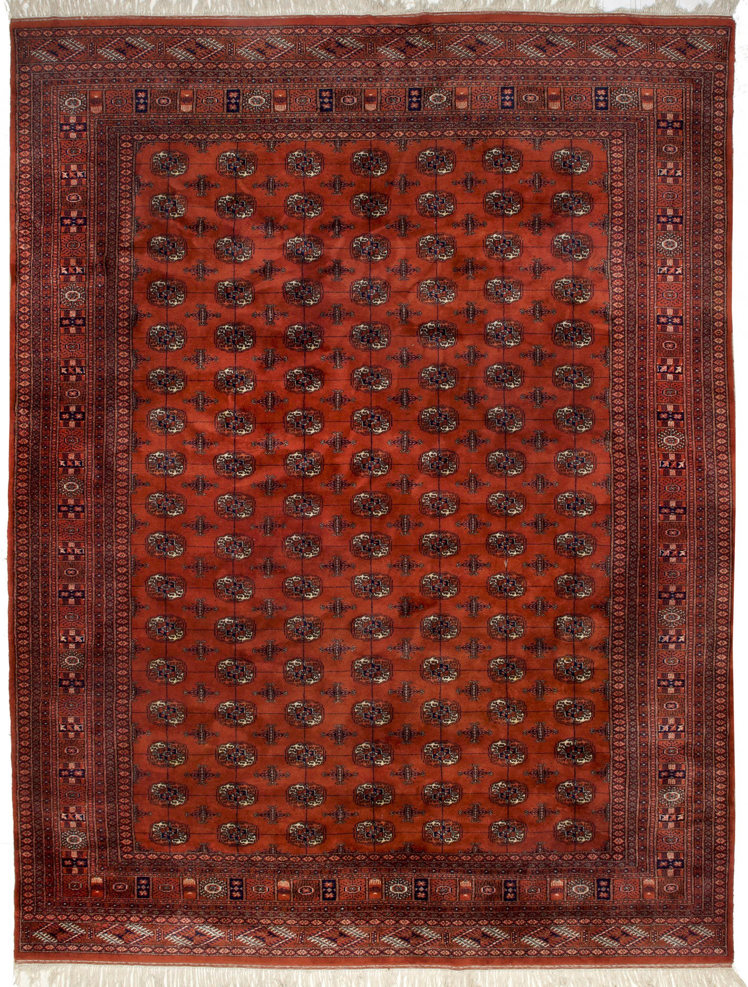 Großer Bucchara-Teppich Pakistan. Wolle auf Baumwolle. Im rot-braunen Innenfeld flächendeckende Göl-Musterung im Rapport. Umlaufend breite, mehrteilige Bordüre. 345 cm x 260 cm.