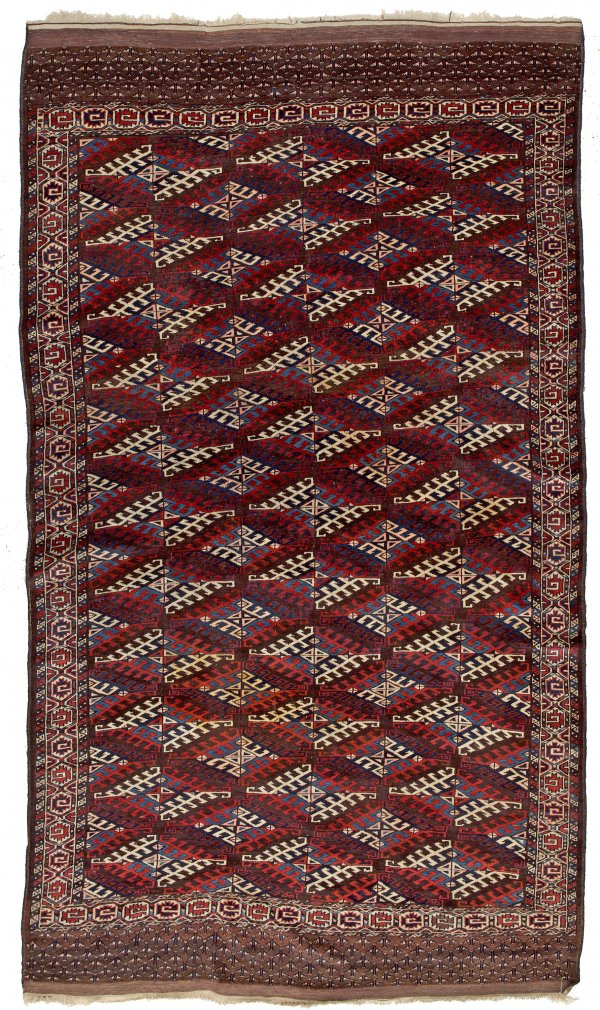 Antiker Yomud-Teppich Turkmenistan. 19. Jh.; Wolle auf Wolle. Auf aubergine-braunem Fond flächendeckende, dichte Musterung aus hakenbesetzten Rautenmotiven im Rapport. Umlaufend breite, mehrteilige Ornamentbordüre sowie Kurzseiten mit breiten Abschlüssen. Seiten rest.; 195 cm x 170 cm.