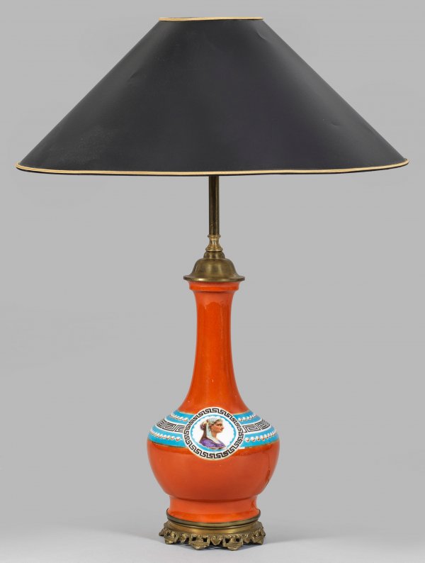 Tischlampe 1-flg.; Messing, Porzellan. Über antikisierendem, durchbrochenem Messingfuß balusterförmiger Korpus mit Mäander- und Perlfries auf blauem Grund und Bildnismedaillon einer Ägypterin vor rostrotem Fond. Ovaler, konisch verjüngter Schirm. Elektrifiziert. Ges.-H. ca. 66 cm.